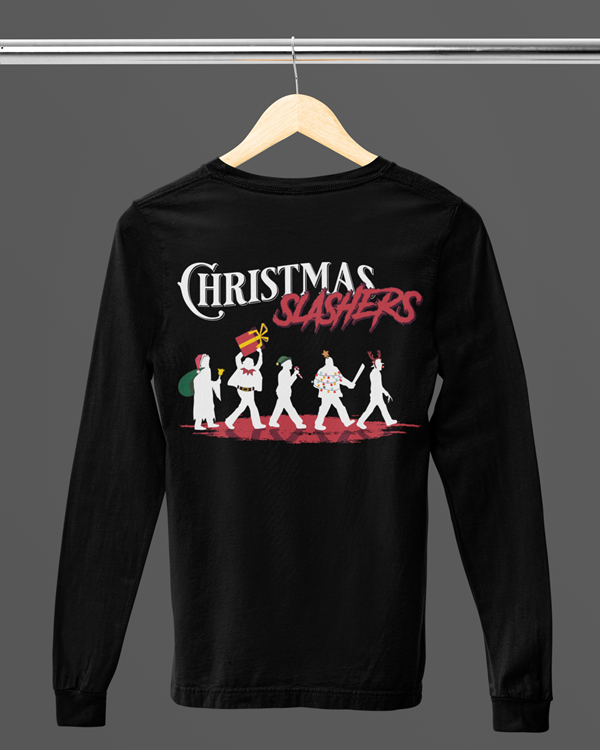 Featuring the iconic silhouettes of infamous slasher legends — drenched in festive chaos, wrapped in deadly ribbons, and marching through a trail of holiday carnage — this design celebrates the unholy fusion of horror and holiday spirit.