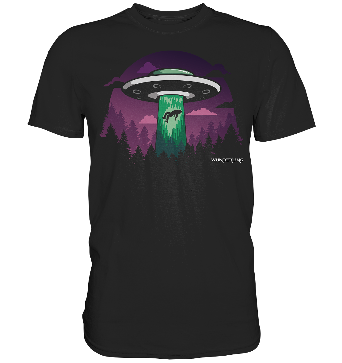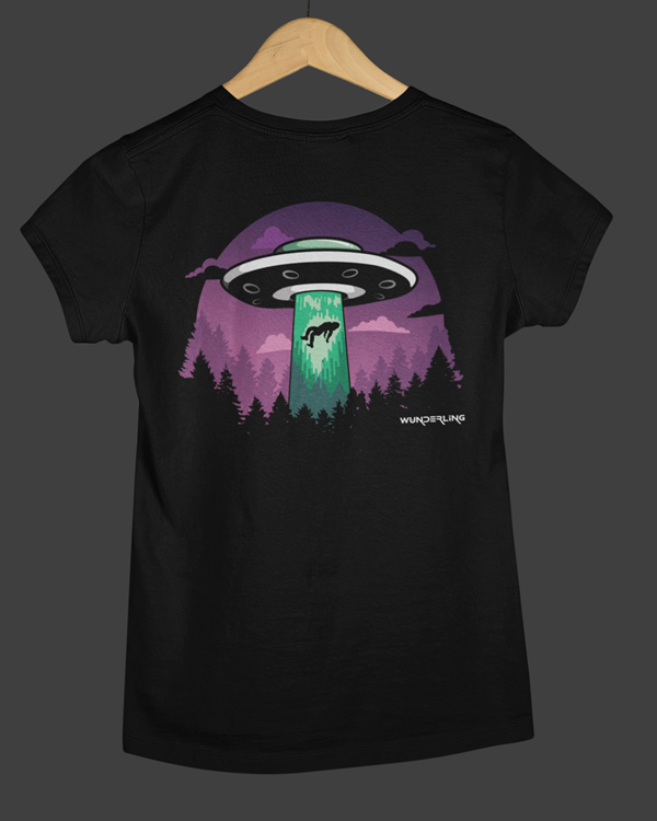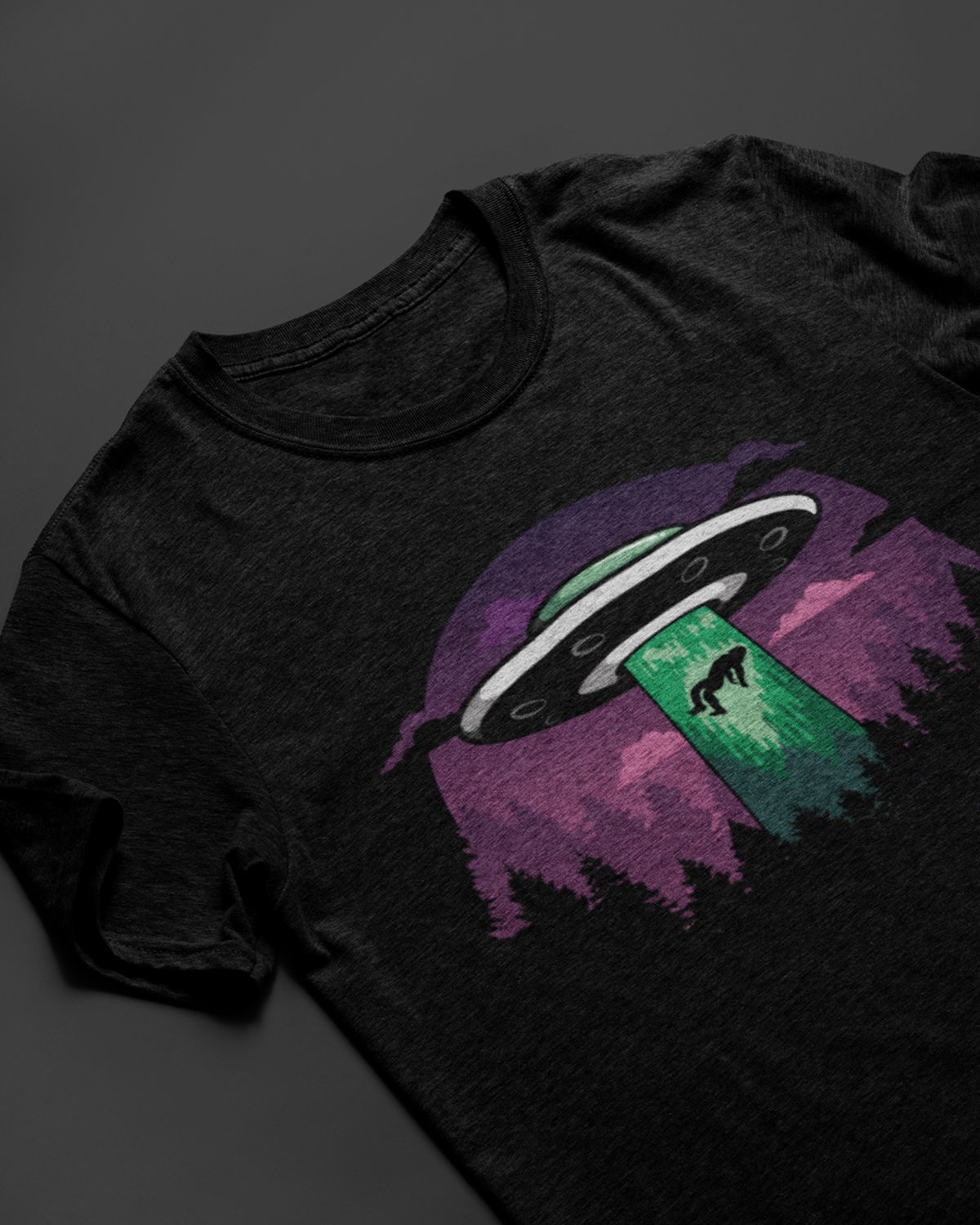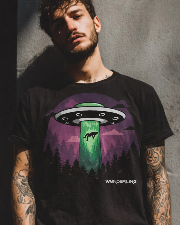This design captures a moment frozen between myth and reality: a UFO hovering above a dark forest, a green beam of light, and a lone figure being pulled into the unknown. Inspired by cryptid folklore, alien encounters and paranormal stories, it turns conspiracy culture into bold visual storytelling.