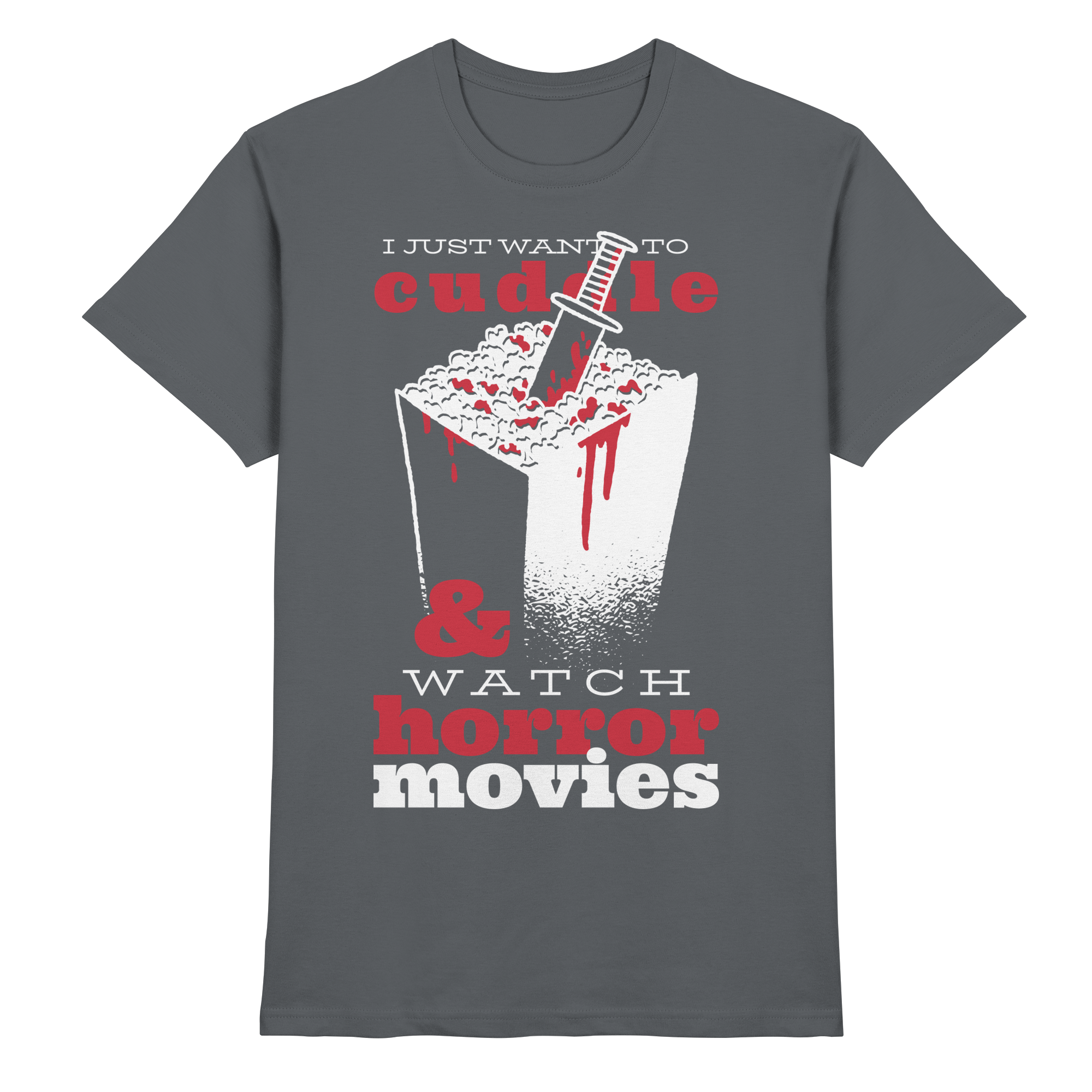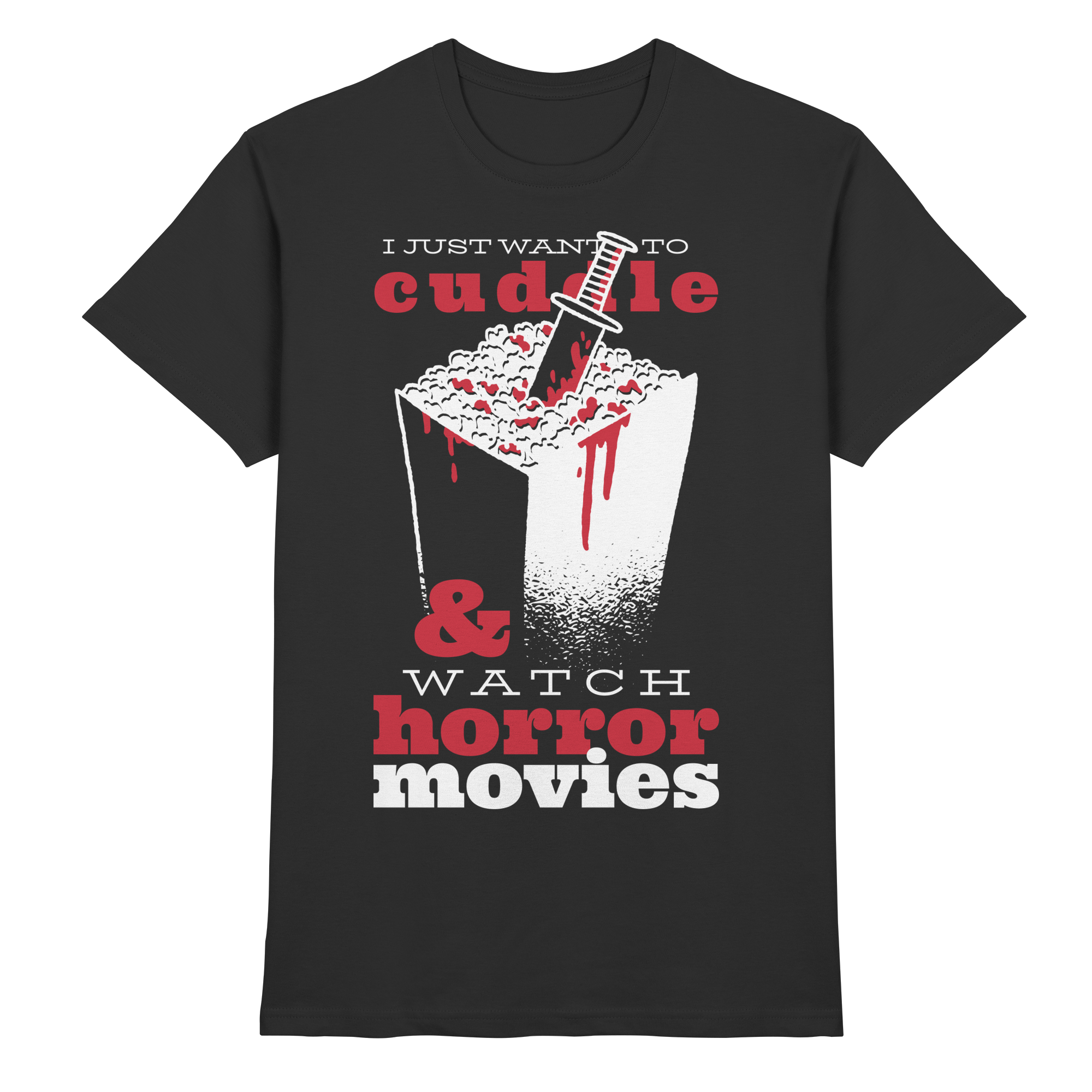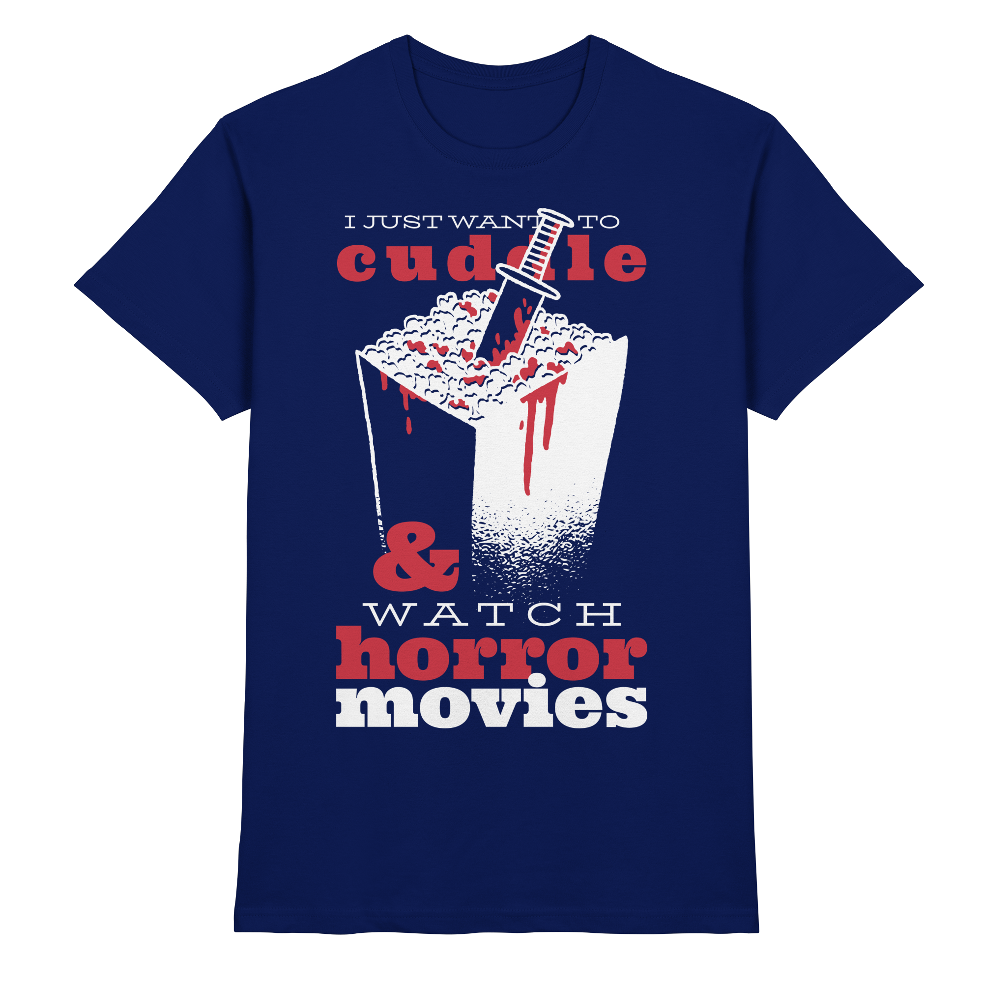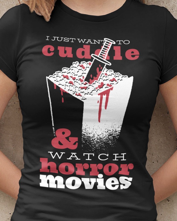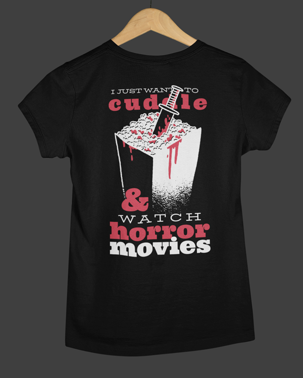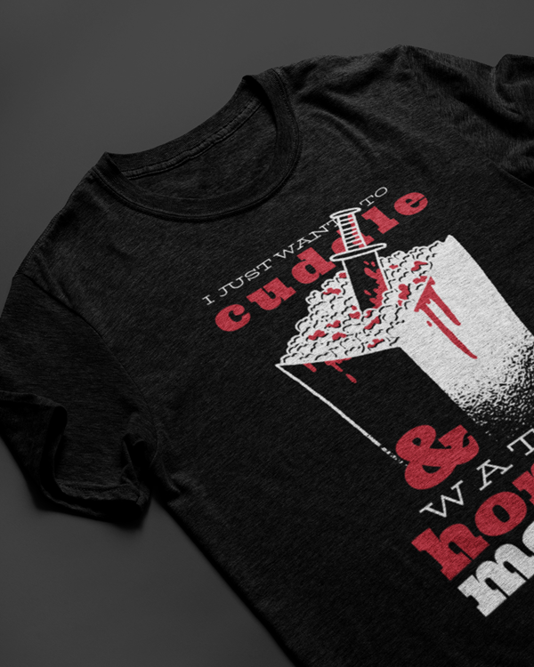 “I Just Want to Cuddle & Watch Horror Movies” is a declaration for those who bond over blood-soaked cinema, late-night silence, and the comfort of darkness. The design blends cozy intimacy with brutal imagery — popcorn turned sinister, affection edged with menace.