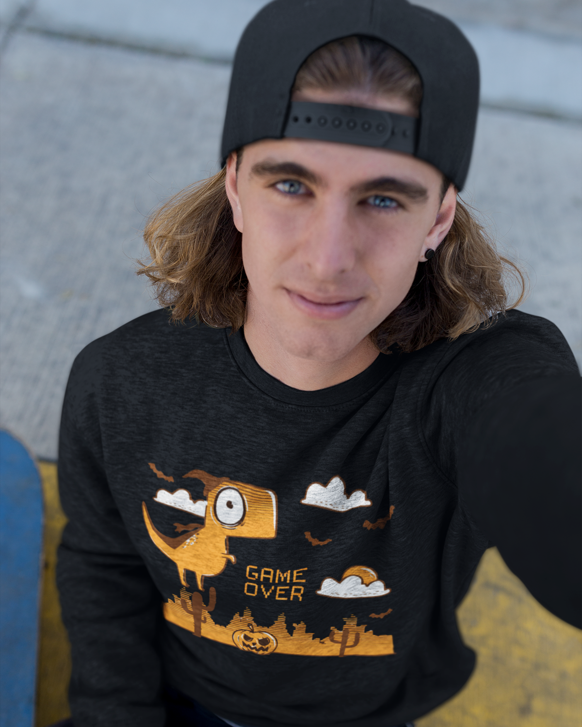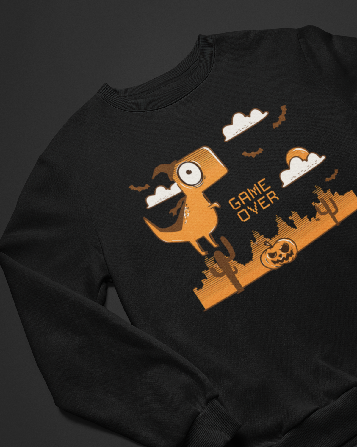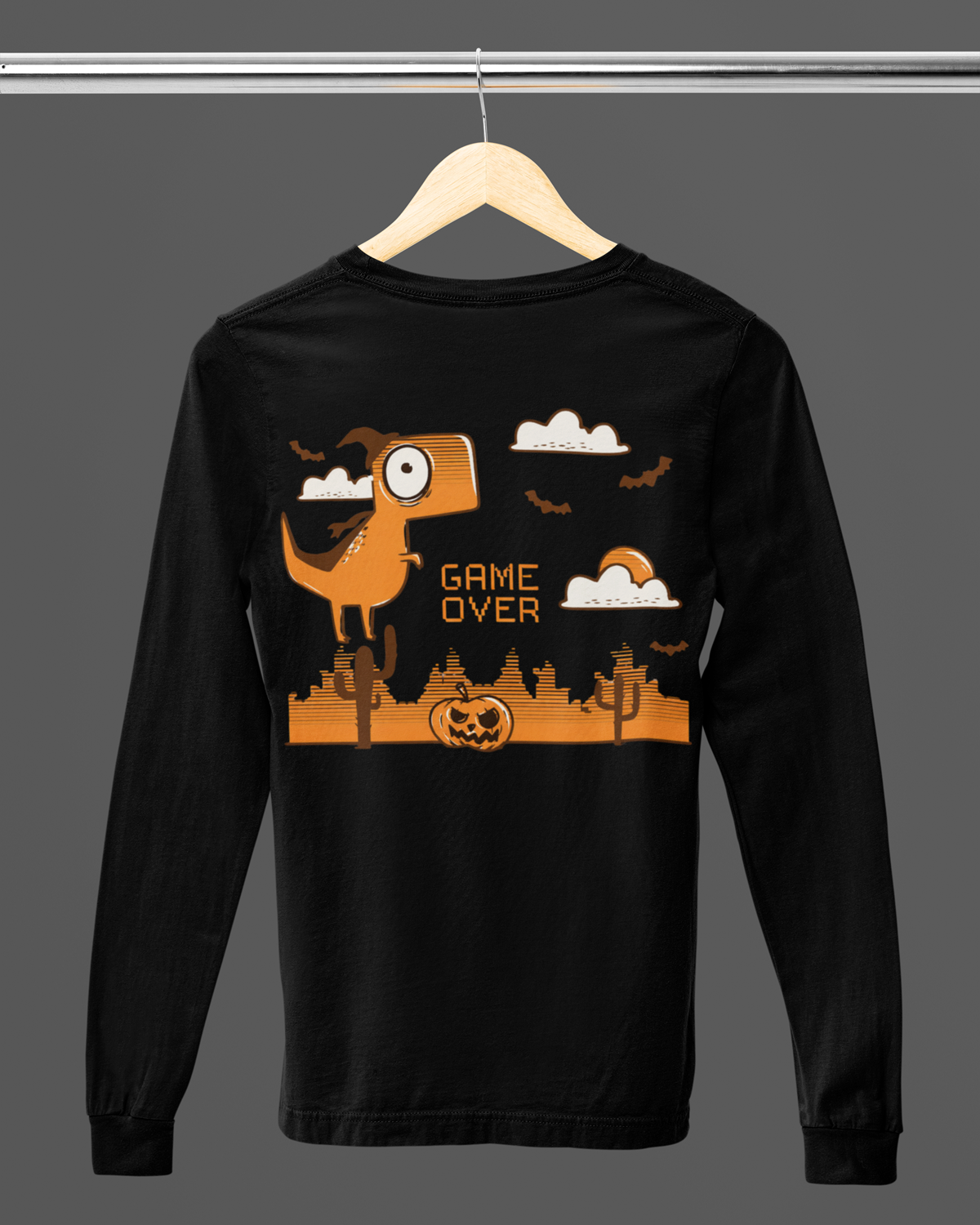 Game Over is a tribute to classic arcade games, pixel-perfect nostalgia and the unmistakable feeling of seeing those final words on screen. This design combines a retro dinosaur character with old-school gaming aesthetics and a subtle Halloween edge.