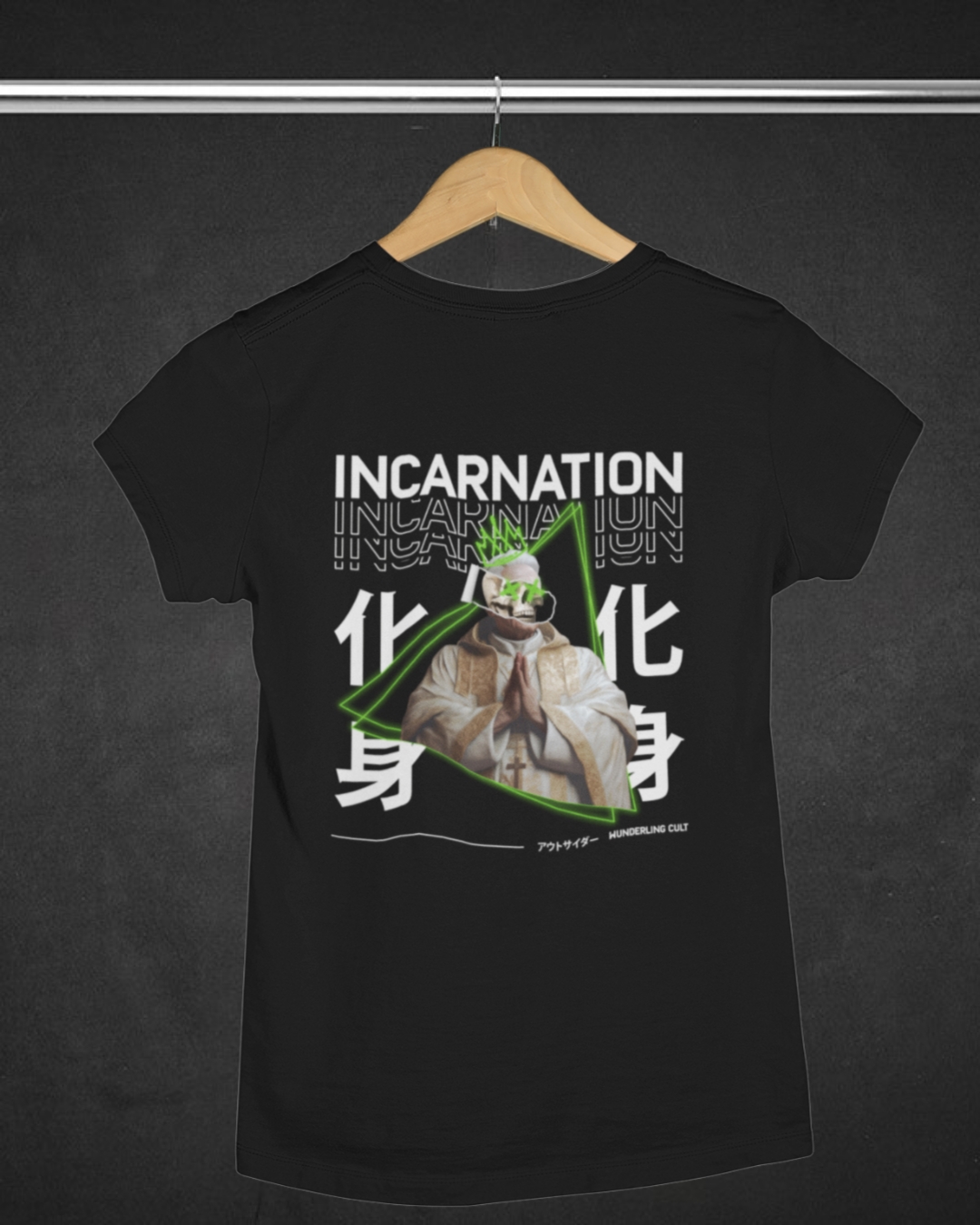 Introducing our „Incarnation” T-Shirt, a meditation on power, faith, and the skeletons beneath gilded robes. This design unveils a pope in prayer, his crowned head replaced by a skull—an unsettling fusion of devotion and mortality. Above him, the word “INCARNATION” echoes, not as divine promise, but as a stark revelation: that even holiness is bound to bone. The imagery dissects the theater of authority, where ritual masks fragility, and crowns rest on hollowed truths.