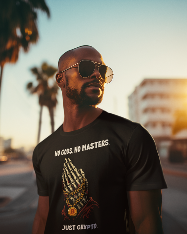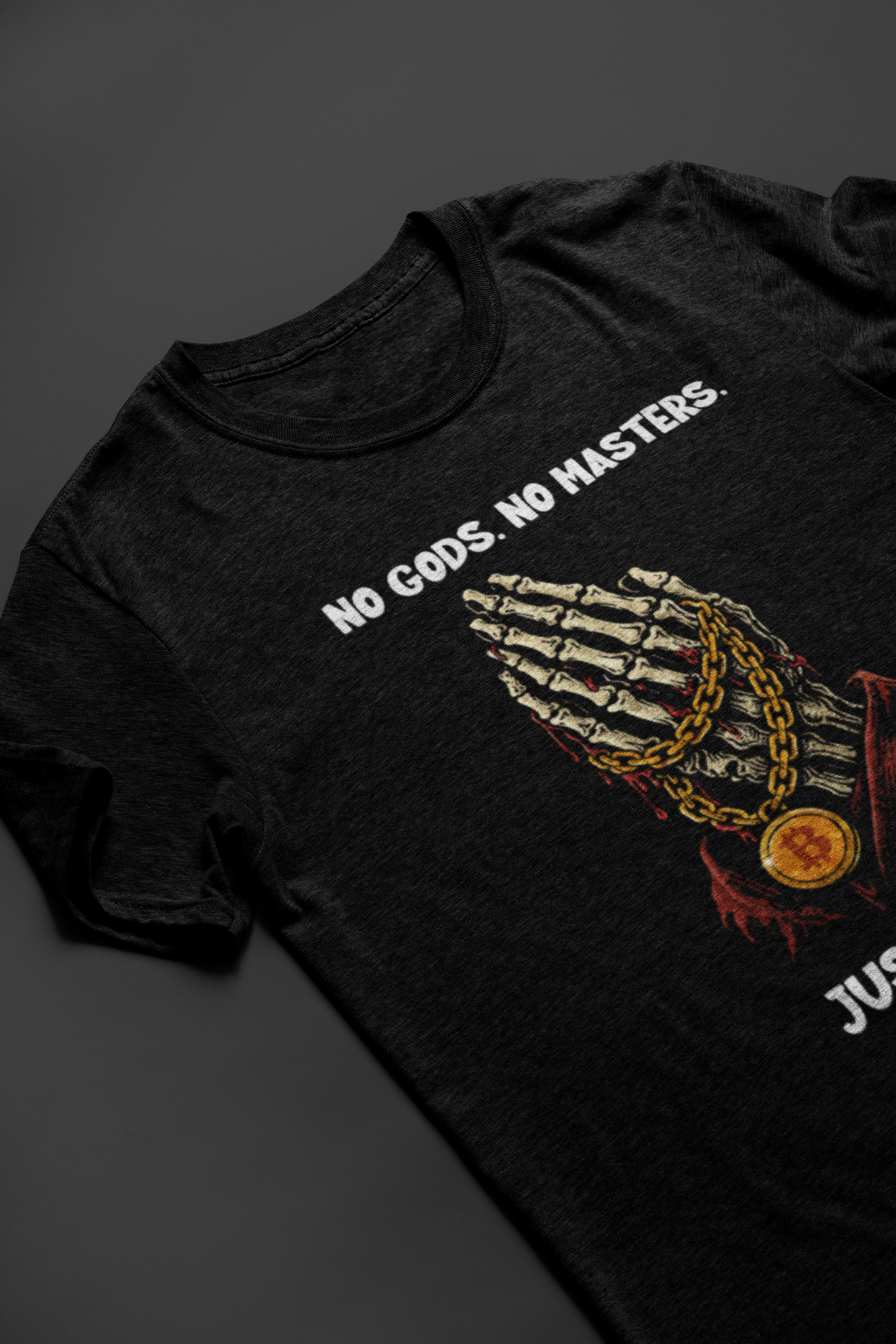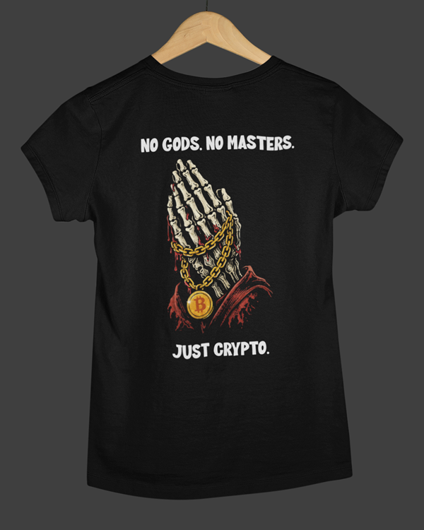 No Gods. No Masters. Just Crypto. represents absolute independence from outdated systems, blind authority, and empty promises. The skeletal hand wrapped in heavy chains, crowned with a Bitcoin symbol, stands for resistance, self-sovereignty, and digital freedom in a world built on control.
