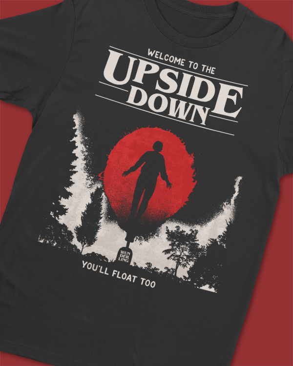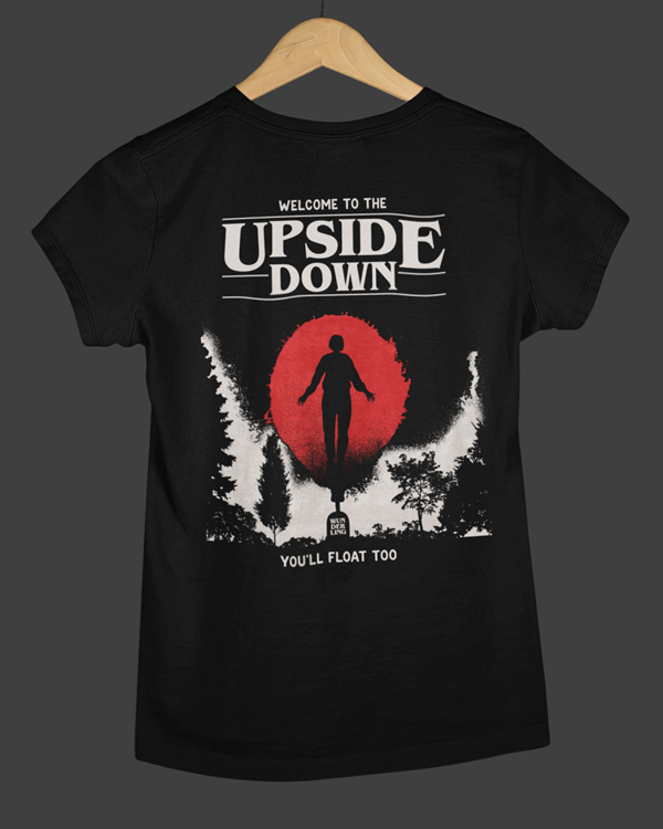 Welcome to the Upside Down is a tribute to dark dimensions, parallel worlds, and the thin line between curiosity and fear. The floating figure against a deep red sun represents crossing into the unknown — a place where gravity fades and reality twists.